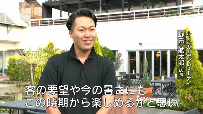 (ルーフガーデンレストラン 野元航太郎店長)「客の要望や今の暑さにもこの時期から楽しめるかと思い、今年は4月からの営業をスタートした。これからもっと暑くなってくると思うので、料理とお酒を暑さに耐えられるように用意している」