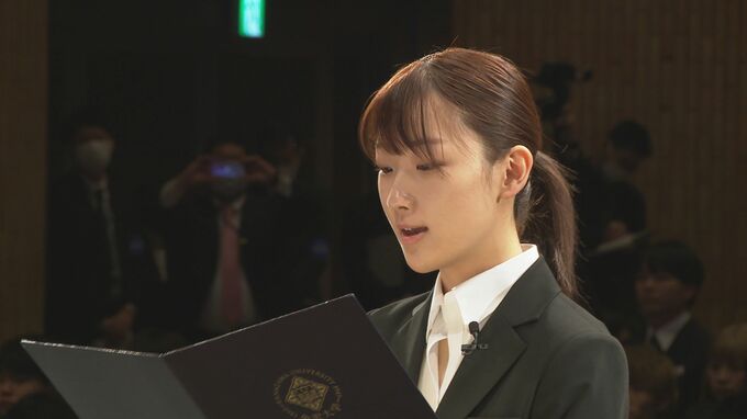 新入生を代表して、人間社会学域法学類の山谷美有さんが「金沢大学に入学するにあたり、諸規則を守り、大学生としての本分を自覚し、勉学に精励することを誓います」と宣誓しました。