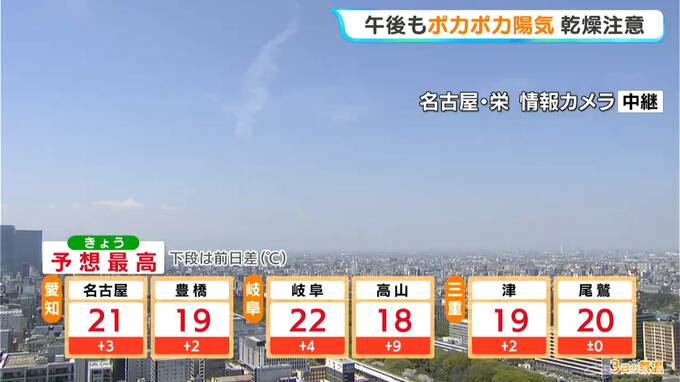 最高気温は名古屋や岐阜、尾鷲で20℃以上、高山では18℃の予想です。日差しが強まり、各地で過ごしやすい陽気になるでしょう。