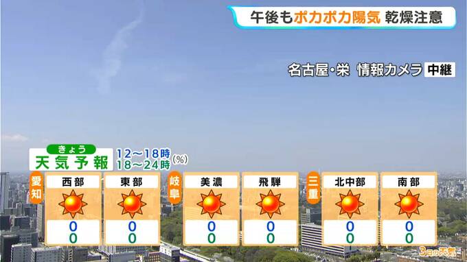 きょうは午後も広く晴れるでしょう。沿岸部では風が強まる所がある見込みです。美濃地方を中心に空気が乾燥しやすくなるため、火の取り扱いにはご注意ください。