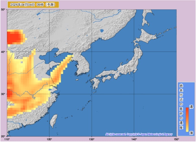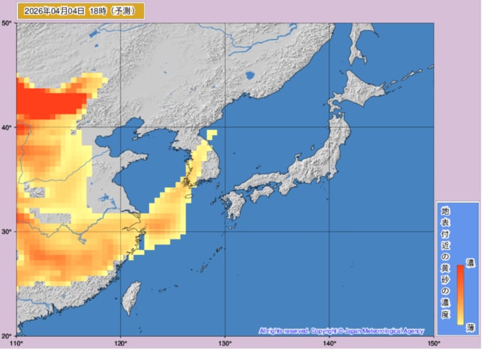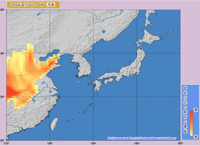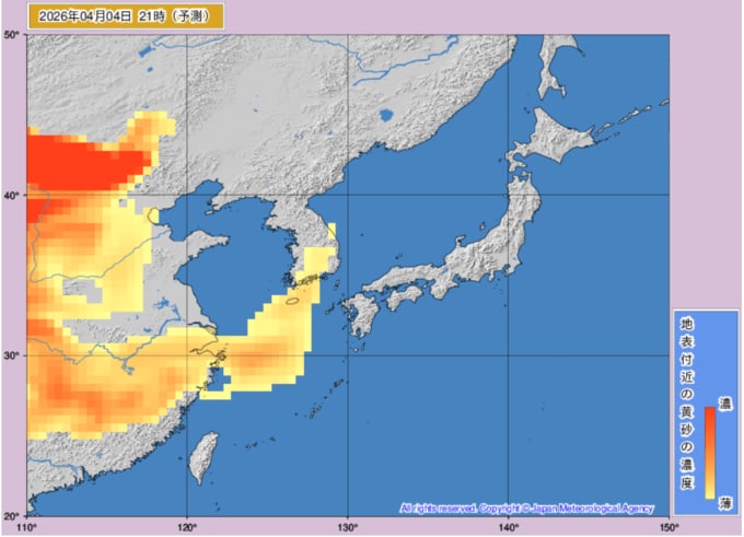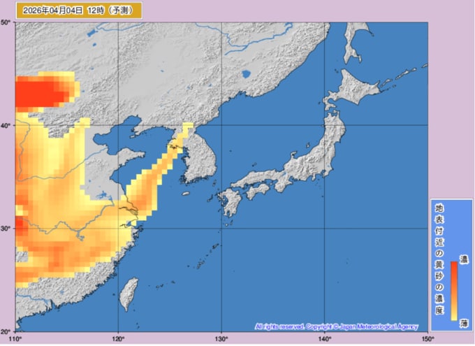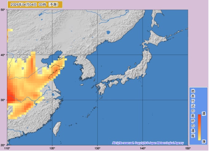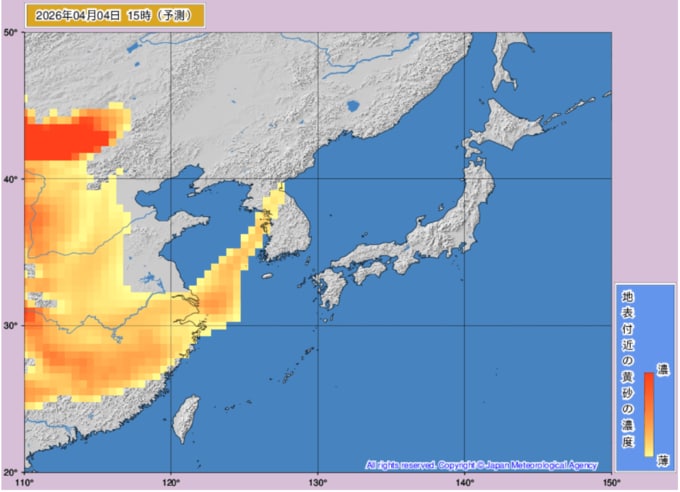 【黄砂情報】5日~6日かけ九州地方、中国地方に黄砂飛来か...4日~6日の黄砂シミュレーション いつどこに、どれくらい飛んでくる? 黄砂を上空から見たデータで確認 気象庁発表 全国の天気を画像で テレビユー山形 2026年4月3日(金) 15:00 国内 ■黄砂はいつどこに?(4日)