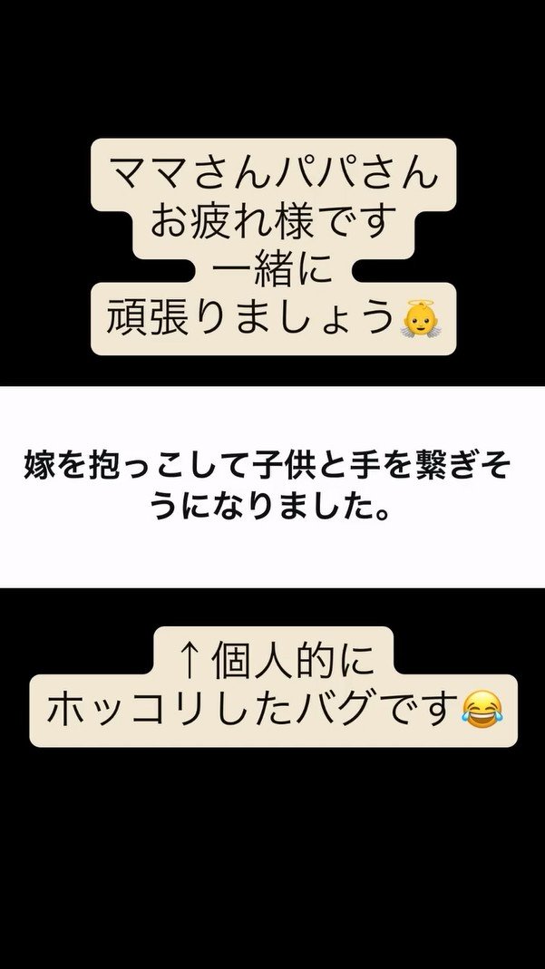 真木さんは動画の末尾で「ママさんパパさんお疲れ様です」「一緒に頑張りましょう」と呼びかけ。さらに「個人的にホッコリしたバグです」とエピソードを紹介。それはフォロワーからの「嫁を抱っこして子供と手を繋ぎそうになりました」という、微笑ましいものでした。今回の投稿にフォロワーからは共感の声が集まっています。