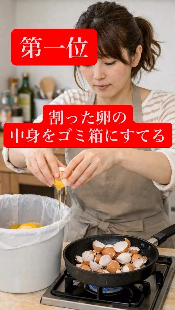 そして「第一位は」「割った卵の中身をゴミ箱にすてる」。これもAI生成と思われる画像とともに紹介していますが、ゴミ箱や台所のシンクの三角コーナーなどに黄身と白身を流してしまって、殻をお皿やフライパンなどに大事に置いてしまう、完全にアベコベな状態です。