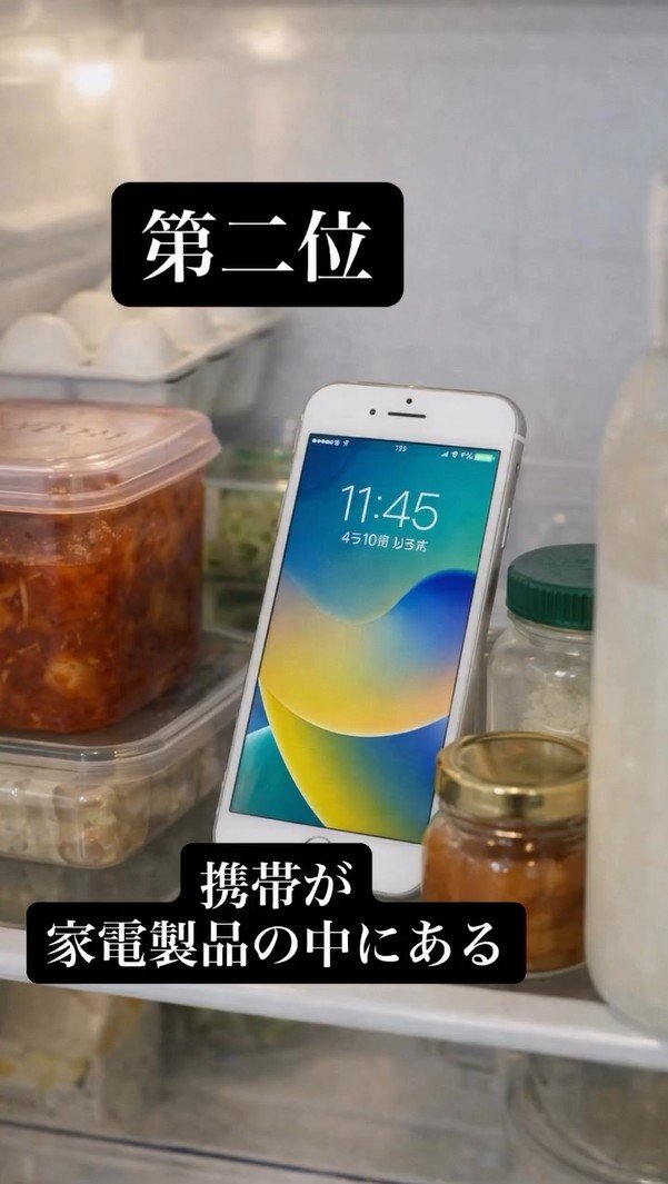 「上位2位の発表です」として披露した「第二位」は「携帯が家電製品の中にある」。真木さんの動画には、冷蔵庫の中に、食品にまぎれて何故かスマートフォンが立てて置いてあるAI生成画像が登場。なかなか見つかりづらそうなシチュエーションです。