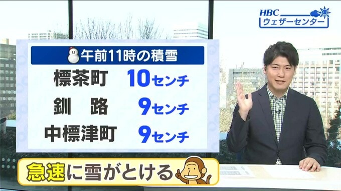 2日午後11時時点の積雪は釧路で20センチ、釧路地方の標茶町は27センチなど、3日朝は雪かきに追われるほどでしたが、3日午前11時の積雪は釧路が9センチ、標茶町は10センチなど急速に積雪が減っています。