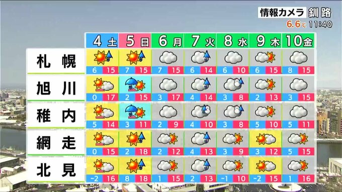 5日の最高気温は、札幌や旭川が15℃、オホーツク海側の網走や北見で18℃、帯広は21℃まで上がり、北海道では今年初めて20℃を超える見込みです。
