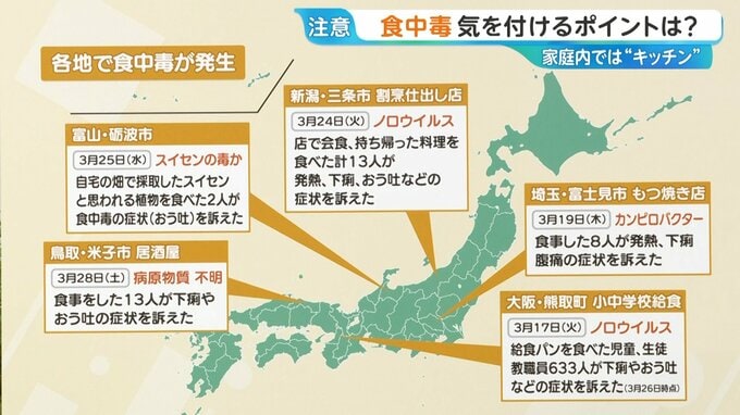 新潟県三条市の割烹仕出し店では、3月24日に持ち帰った料理を食べた13人が発熱・おう吐・下痢などの症状を訴え、ノロウイルスが検出されました。