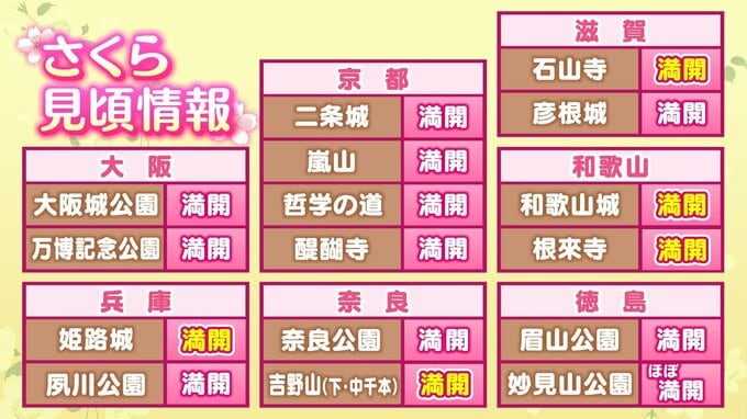 桜が見ごろを迎えています。近畿では大阪城公園に万博記念公園、京都の二条城や嵐山、哲学の道。兵庫の姫路城は満開、滋賀は石山寺などで満開。今週末は家族や友人らとお花見を計画している人も多いでしょう。