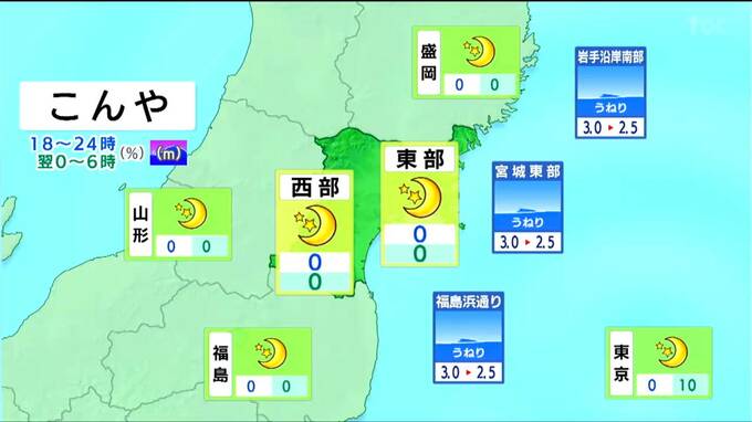 曇りで、昼過ぎからは各地で雨が降るでしょう。南寄りの風が強まるため、東部は昼前から強風に注意が必要で、海上は暴風となるおそれもあります。昼過ぎからは高波にも注意が必要です。