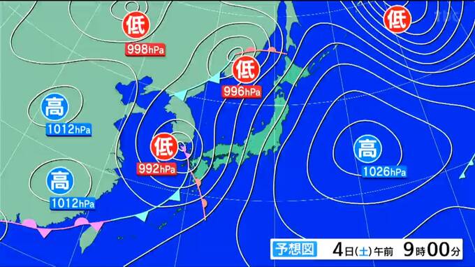 低気圧が日本海を東に進み、全国的に天気が崩れそうです。南寄りの風が強まる所が多いでしょう。