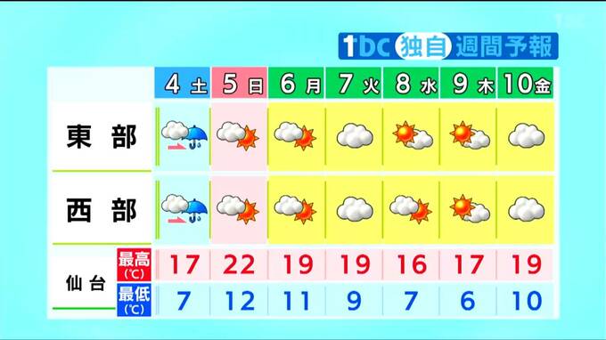 5日日曜は明け方まで雨の降る所もありますが、朝からは曇りや晴れでしょう。最高気温は6月上旬並みまで上がる見込みです。その後も曇りや晴れで、気温は平年より高い日が続くでしょう。