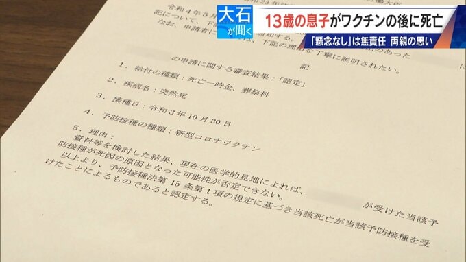 「息子さんの申請に関する審査結果『認定』。疾病名が突然死。『資料等を検討した結果、現在の医学的見地によれば、息子さんが受けた当該予防接種が死因の原因となった可能性が否定できない』と書いてあります」