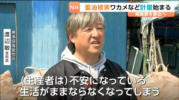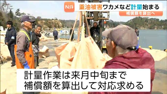 この問題は3月、宮城県塩釜港で宮城海上保安部の巡視船「ざおう」から1000リットルを超える重油が漏れ出したもので、塩釜市ではこれまでワカメやコンブなど1000トン以上が被害を受けています。計量作業は5月中旬まで行われ漁協は、補償額を算出して、宮城海上保安部に対応を求めることにしています。