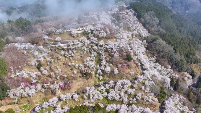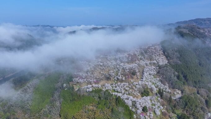 霧とサクラの競演です。岡山県美咲町の三休公園で約5,000本のソメイヨシノが満開を迎え、里山を春色に彩っています。