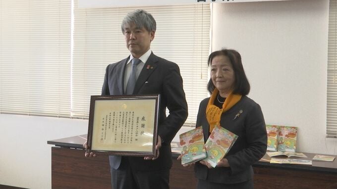 3日は盛岡市で贈呈式が行われ、トヨタ八社会の元持儀之会長から県交通安全母の会連合会の神谷ミツ子会長に絵本3万部の目録が手渡されました。