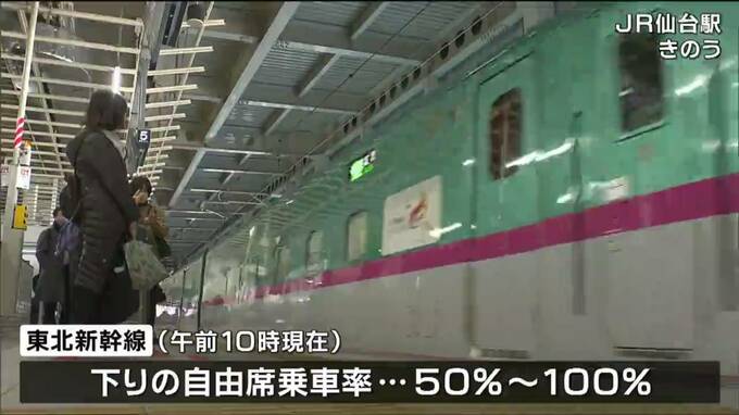 年末年始を故郷で過ごす人たちの帰省ラッシュがピークを迎えていて東北新幹線は混雑が続いています。JR東日本によりますと東北新幹線は30日午前10時現在、「下り」の自由席の乗車率が50%~100%となるなど、故郷へ帰…