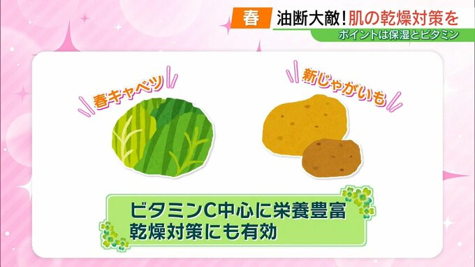 石原さんのおすすめは、この時期旬の春キャベツや新じゃがいもを積極的に摂ること。ビタミンCを中心に栄養が豊富で、乾燥対策にも有効と言われているんだそう。スキンケアに加え、水分や栄養素をとることで体の内側からケアしていくことも欠かせません。
