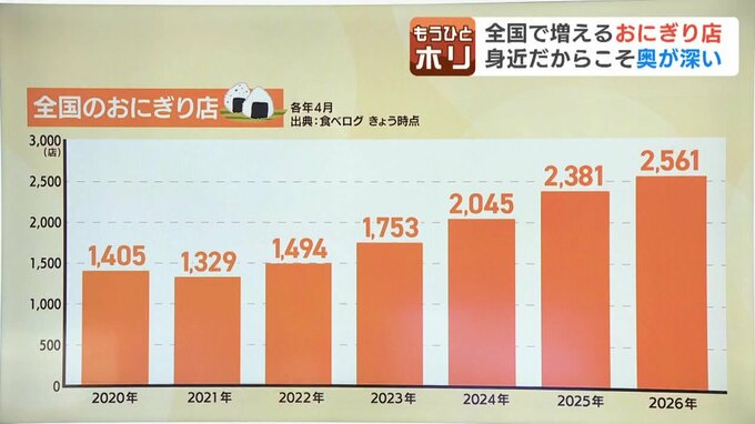 レストラン検索・予約サービスの『食べログ』のまとめなのですが、全国のおむすび店の数は、6年前は1400店ほどでしたが、4月は2561店まで増えました
