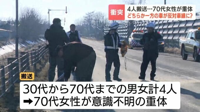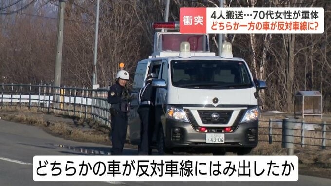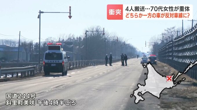 3日午後、北海道斜里町の国道で乗用車と軽乗用車が衝突し、4人が病院に運ばれ、このうち70代の女性が意識不明の重体です。