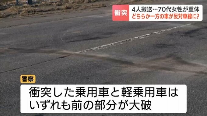 現場は、見通しのいい片側1車線の直線道路で、警察によりますと、衝突した乗用車と軽乗用車はいずれも前の部分が大破していました。