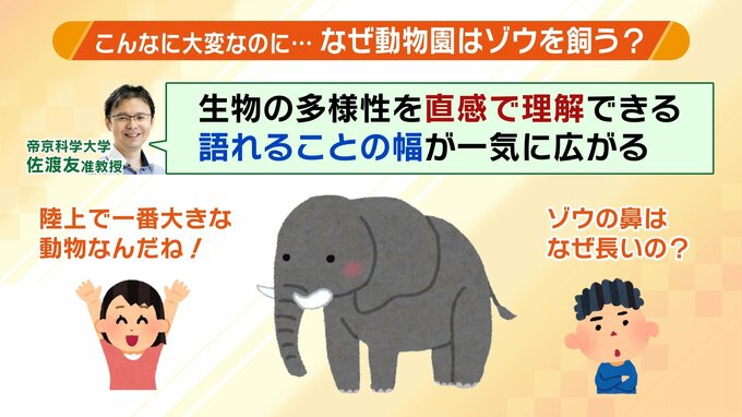 【8年ぶり】天王寺動物園にゾウが来た!“バスケコート16面分”総工費44.6億円の『ゾウ舎』を福島アナが取材…3つのヒミツに迫る!一般公開前に会いに行ってみた!【解説】 毎日放送 2026年4月4日(土) 10:00 国内 大変なのに…なぜ動物園はゾウを飼う? こんなに大変なのに、なぜ動物園はゾウを飼うのか…? 佐渡友准教授は「生物の多様性を直感で理解できる」からだと言います。「陸上で一番大きな動物!」「ゾウの鼻はなぜ長い?」など、ゾウがいることで語れることの幅が一気に広がるようです。