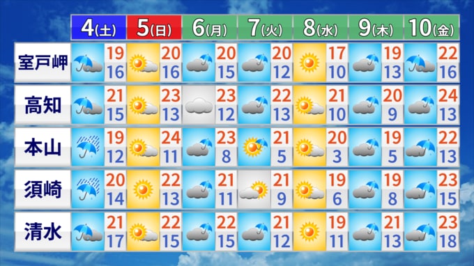 5日は広い範囲で日差しが届き、本山町では24℃と初夏の陽気がやってきそうです。来週は低気圧や前線の影響で傘の出番が多くなるでしょう。