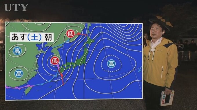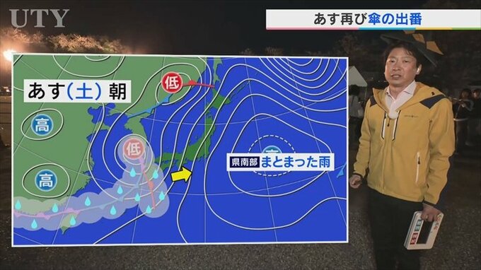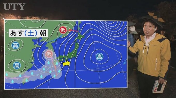 これによって雨が降りまして、特に南から雨雲のもととなる暖かく湿った空気がぶつかりやすい県の南部=峡南や富士五湖を中心にまとまった雨となりそうです。