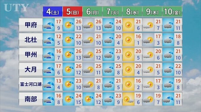 その暖かい空気が来週の月曜日にかけて残る予想です。甲府は2日連続の25℃以上の夏日となりそうです。