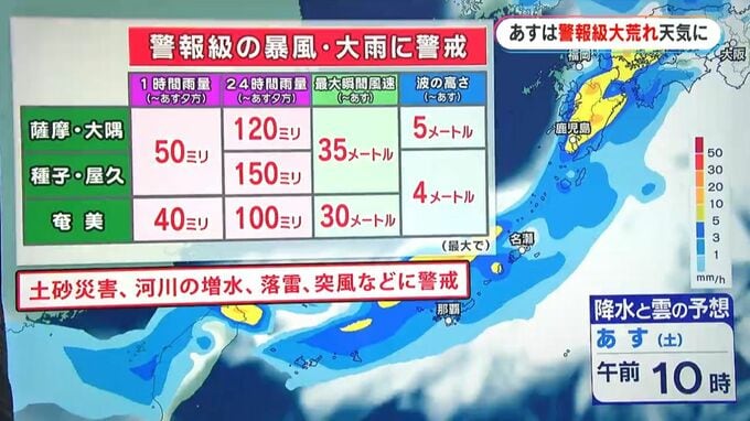 4日の雨雲の予想では、午前0時から西の方から活発な雨雲が強い南風を伴って接近してきます。4日の昼前は県本土付近では雷を伴って非常に激しく降る恐れがあります。