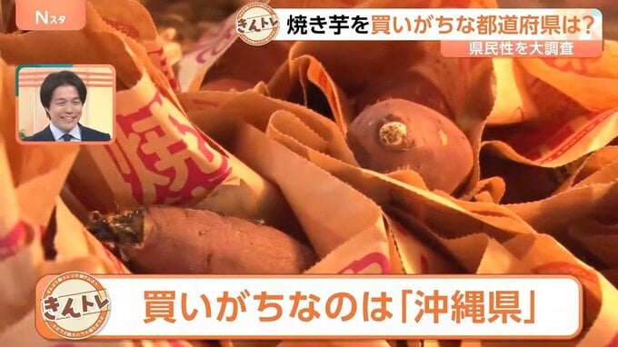 それでは、ついつい手が伸びてしまう「焼き芋」。国内で年間17億円以上も売り上げているといいます。この焼き芋をよく購入した都道府県は「沖縄県」です。「県民の3.2人に1人が買った」という計算になるそうです。