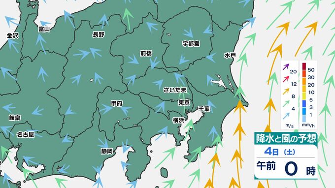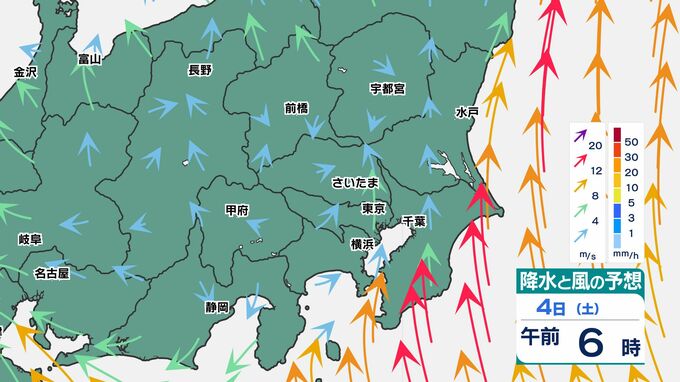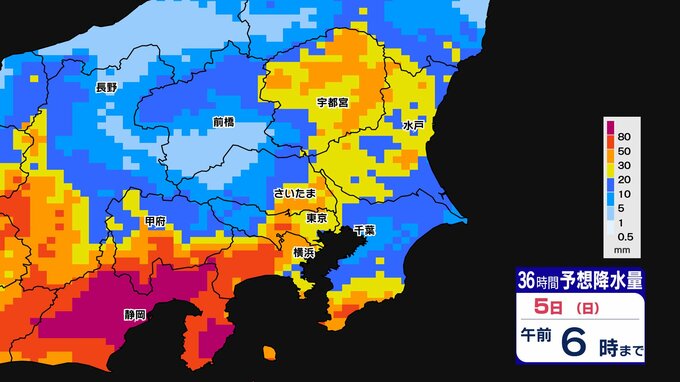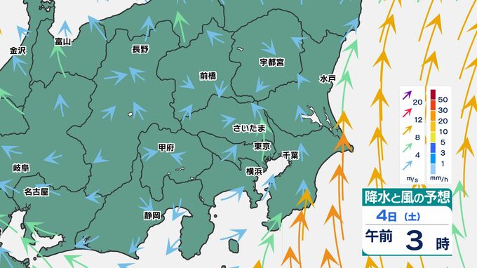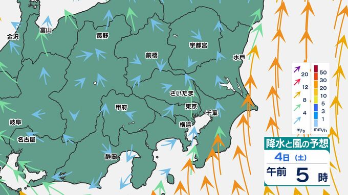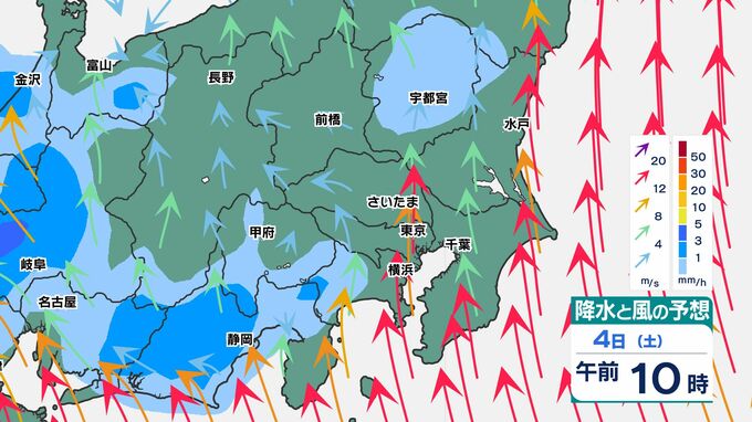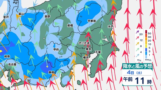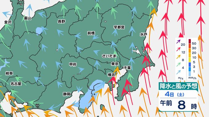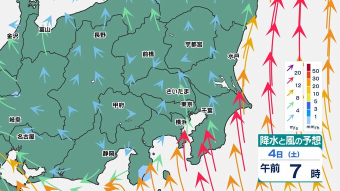 東京都心でも30ミリ前後の雨になりそうです、関東地方南部ほど大雨になるでしょう。また前線通過時は、南風が強まるため、4日(土)から5日(日)朝は「荒れた天気」です。