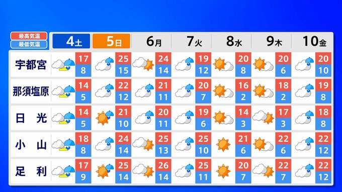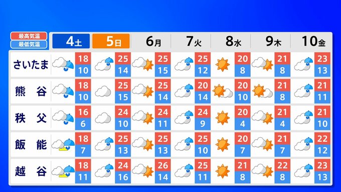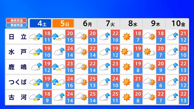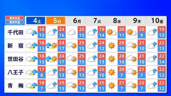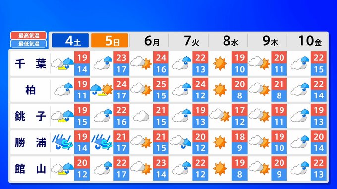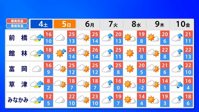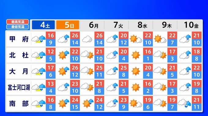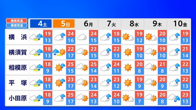 【東京首都圏 荒れた天気】さくらには「試練の雨と風」【雨と風シミュレーション4日(土)5日(日)/週間予報】東京・神奈川・埼玉・千葉・群馬・栃木・茨城・長野・山梨 南日本放送 2026年4月3日(金) 21:00 国内 天気 関東甲信地方 各都市の週間予報(4日(土)~10日(金)) 週間予報を画像で掲載しています(各都県5か所ずつ)。神奈川県の場合、横浜市・横須賀市・相模原市・平塚市・小田原市です。 5日(日)南風が暑い空気を持ち込んで、「夏日」になるところもあるでしょう。