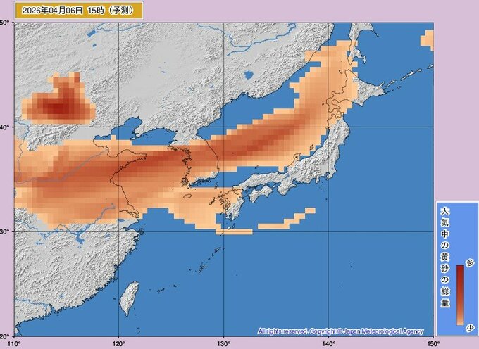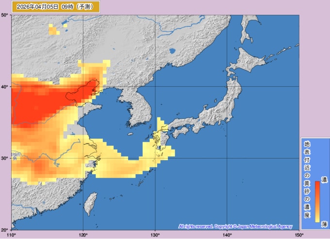 気象庁の予測では、4日深夜から5日未明にかけて大陸から黄砂が飛来し、九州、沖縄など西日本に飛来が予想されています。