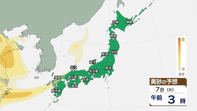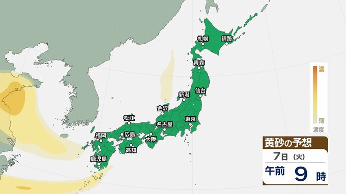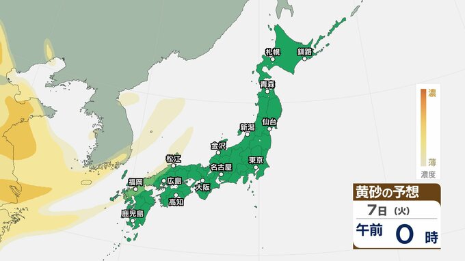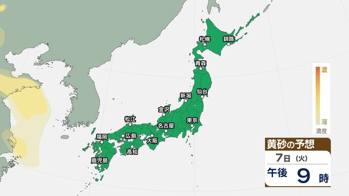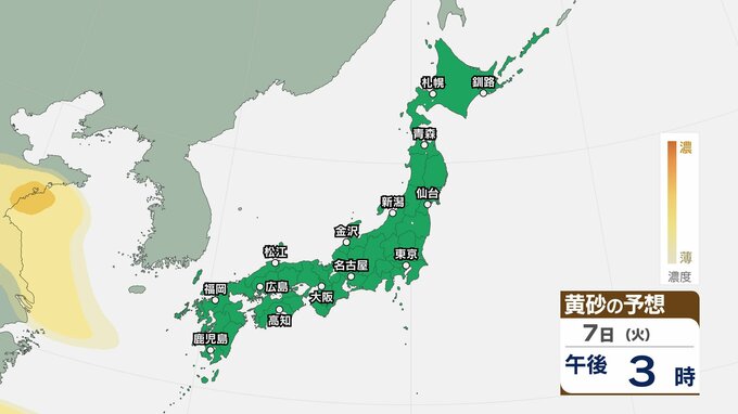 【黄砂情報】5日(日)九州・中国の広い範囲で影響の可能性 日本列島に黄砂が飛来か…【気象庁 黄砂シミュレーション/4日現在】 RSK山陽放送 2026年4月4日(土) 10:11 国内 天気 7日(火) 4日(土)~7日(火)黄砂シミュレーション 4日(土)~7日(火)黄砂シミュレーション 飛来が予測されるエリアでは、洗濯物などを屋外で干す際は注意が必要です。また目、鼻、皮膚などに関するアレルギー体質の方や、喘息など呼吸器に疾患がある方は、十分に注意してください。