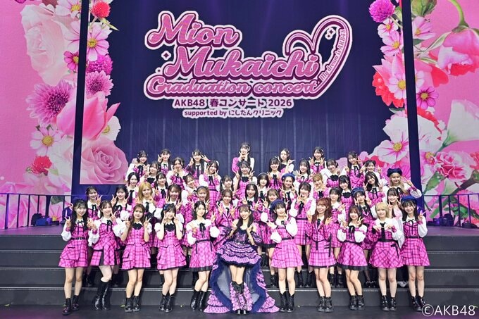 AKB48 春コンサート2026 向井地美音卒業コンサート 〜私の夢は、AKB48〜 が国立代々木競技場で開催。現役メンバー48名に加え、ノースリーブス(高橋みなみさん、小嶋陽菜さん、峯岸みなみさん)や柏木由紀さん、横山由依さんら卒業生も駆け付け、向井地さんのラストコンサートを彩りました。