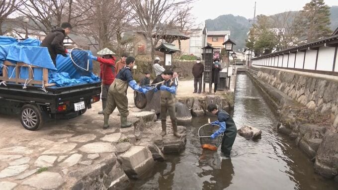 飛騨市古川町では、地元の観光名所の「瀬戸川」に除雪した雪を流すため、冬の間はコイを近くの池に移しています。