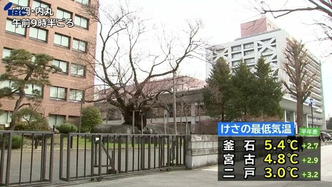 県内の4日朝の最低気温は最も高かった釜石で5.4度、宮古で4.8度、二戸で3度となるなど、ほとんどの地点で平年を1度から3度ほど上回りました。
