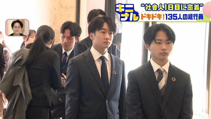 「スーツ姿の新入行員たちが続々と出社してきました。緊張した面持ちが見受けられますね」