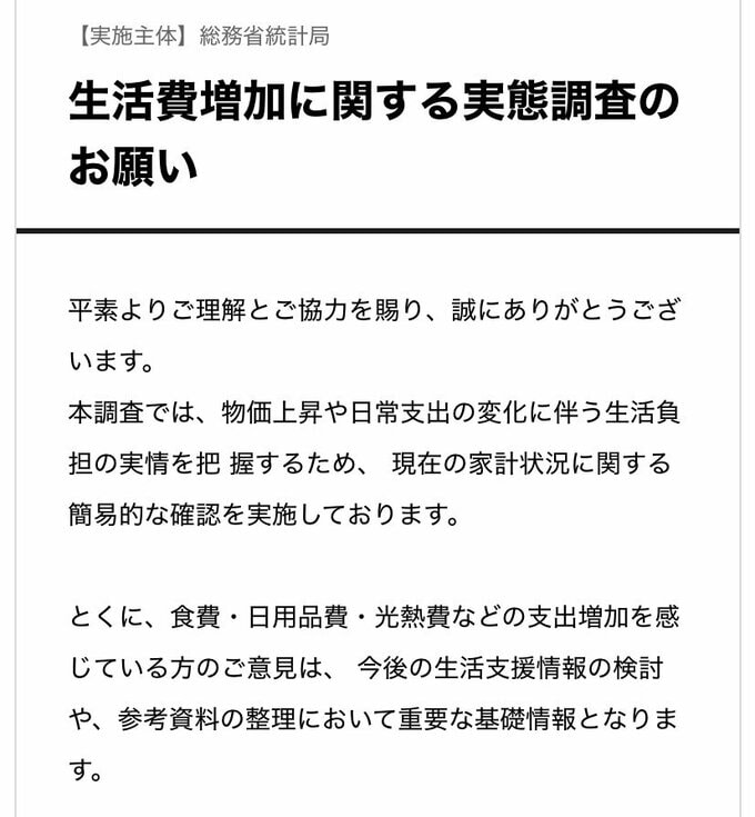 注意が必要なのは、総務省統計局を名乗る「生活費増加に関する実態調査」などという件名のメールです。
