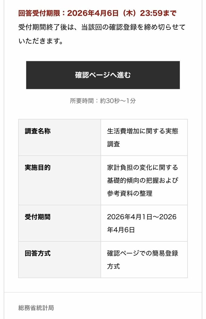 総務省をかたる詐欺メールが全国で確認「生活費増加調査」などとうたい個人情報吸い取りか 総務省が注意を呼びかけ(山形) テレビユー山形 2026年4月5日(日) 08:05 国内 回答期限で気持ちをあおる 実際の詐欺メールの画面を見ると、「回答期限」を強調して手続きを急がせたり、「匿名なので個人情報は不要」と安心させようとしたりする文言が並んでいますが、これらはすべて嘘です。 画像:実際の詐欺メール
