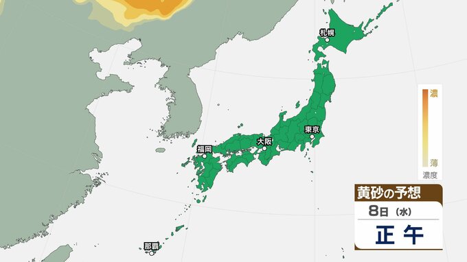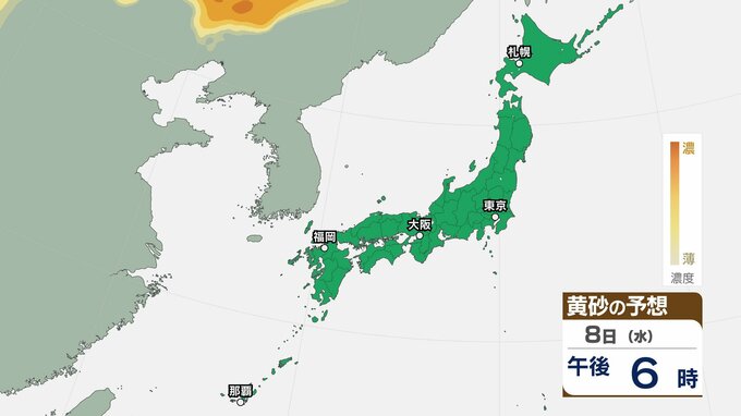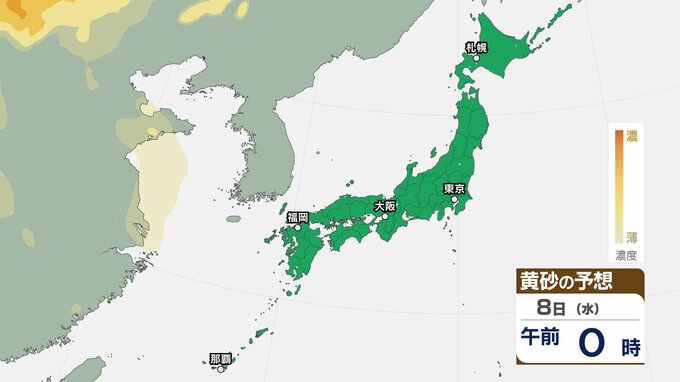 【黄砂情報】きょう5日(日)から九州・中国など西日本の広い範囲で影響の可能性 日本列島に黄砂が飛来か…5日(日)~8日(水)黄砂シミュレーション【気象庁 5日現在】 RSK山陽放送 2026年4月5日(日) 08:48 国内 天気 8日(水) ▶5日(日)~8日(水)黄砂シミュレーション画像 ▶5日(日)~8日(水)黄砂シミュレーション画像 飛来が予測されるエリアでは、洗濯物などを屋外で干す際は注意が必要です。また目、鼻、皮膚などに関するアレルギー体質の方や、喘息など呼吸器に疾患がある方は、十分に注意してください。
