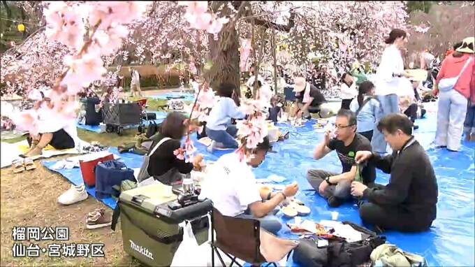 仙台市内のサクラが満開を迎え、公園では午前中から多くの花見客で賑わっています。