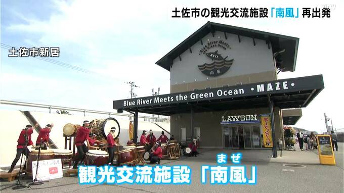 土佐市の観光交流施設の再オープンを記念したセレモニーが行われました。4月1日に再オープンした土佐市新居地区の観光交流施設「南風」。4月5日に行われたオープニングセレモニーでは、明徳義塾中学・高校の和太…