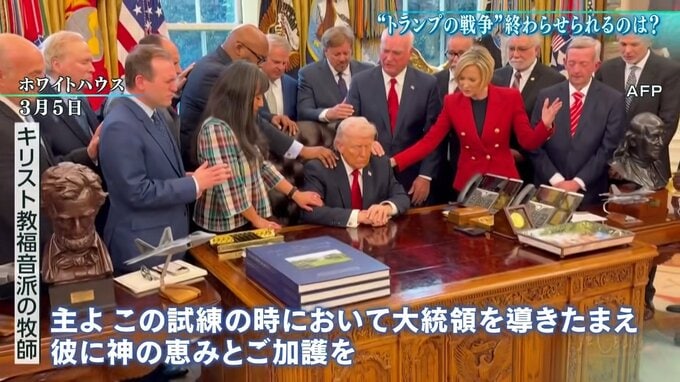 3月、キリスト教福音派の牧師から祈りを捧げられるトランプ氏。
