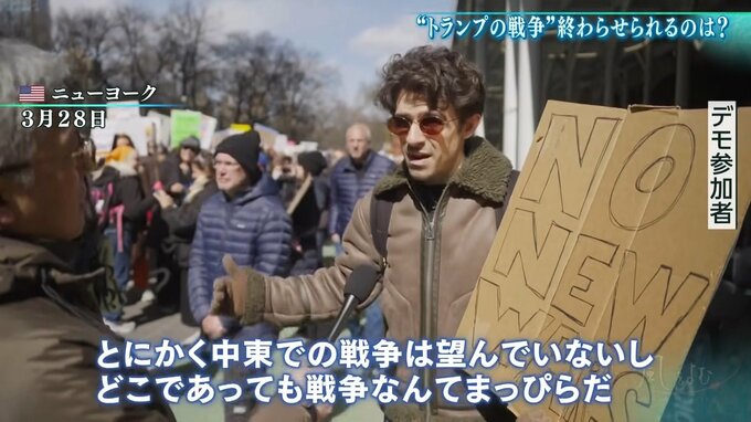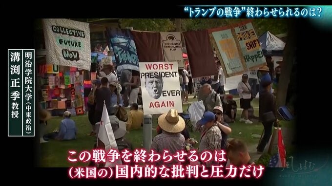 この戦争を終わらせるのは、(米国の)国内的な批判と圧力だけ。デモや支持率低下というのが今後もどんどん続けば、トランプ氏としても(戦争を)続けられないという判断になると思う」