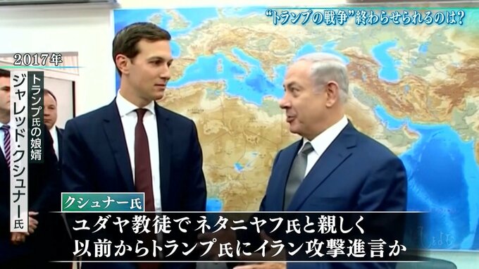 トランプ氏の娘婿で、ユダヤ教徒のクシュナー氏は、ネタニヤフ首相と親しく、以前からトランプ氏にイラン攻撃を進言していたとされます。
