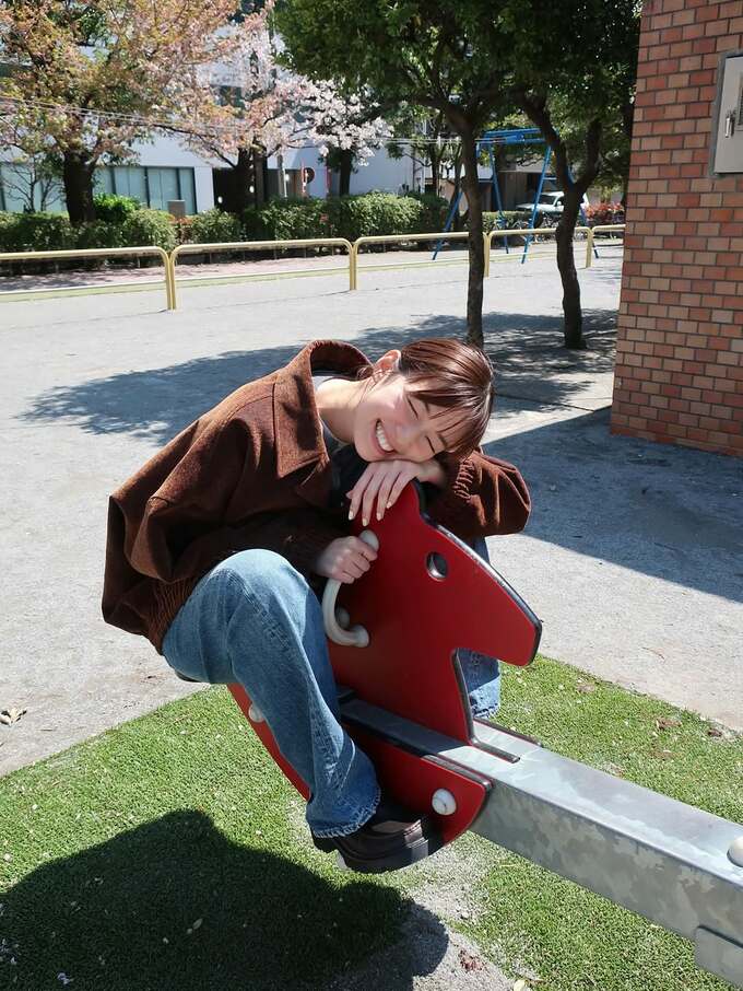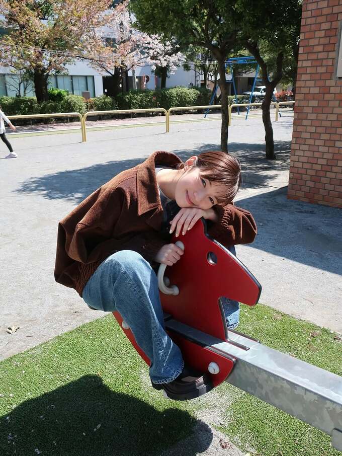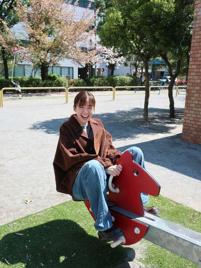 また、公園内にある赤い馬型の遊具に座り、無邪気な笑顔を見せるショットも公開。茶色のコートと青いデニム、赤い遊具のカラフルなコントラストが目を引きます。