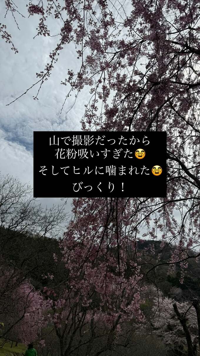 また、前日4月4日のインスタグラムストーリーズでは、山での撮影中に「花粉吸いすぎた」としたうえで、ヒルに噛まれたことも報告。「びっくり!」と驚きをあらわにしていました。