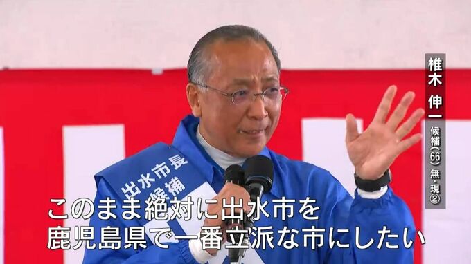 (椎木伸一候補(66) 無・現(2))「今の市政を止めないでください。このまま絶対に出水市を鹿児島県で一番立派な市にしたい。絶対に負けるつもりはない。絶対に勝って新しい出水をつくっていく」