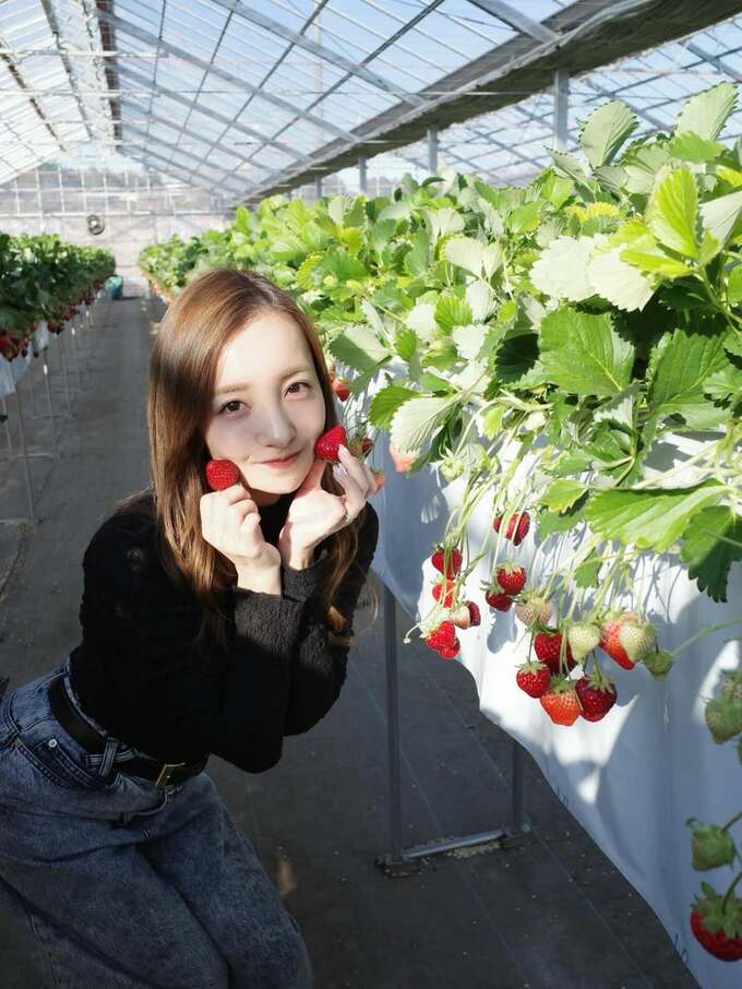 公開された写真では、自然光が降り注ぐ温室の中、板野さんは黒のハイネックトップスにデニムというカジュアルな装いで登場。たわわに実ったいちごの棚を背に、リラックスした表情を見せています。